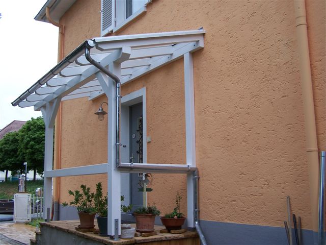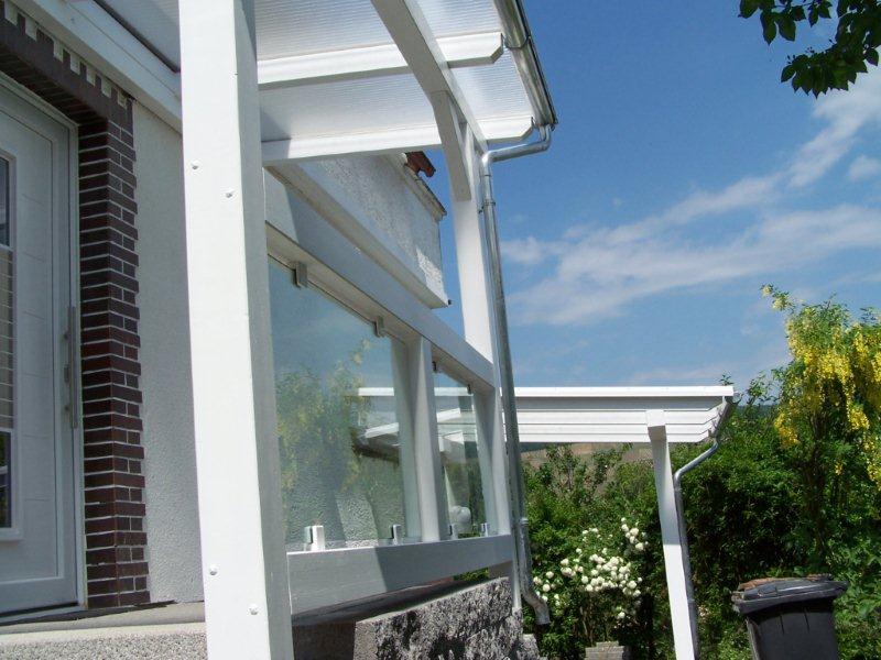 Satteldach weiß, VSG, weiße Kunststoffrinne